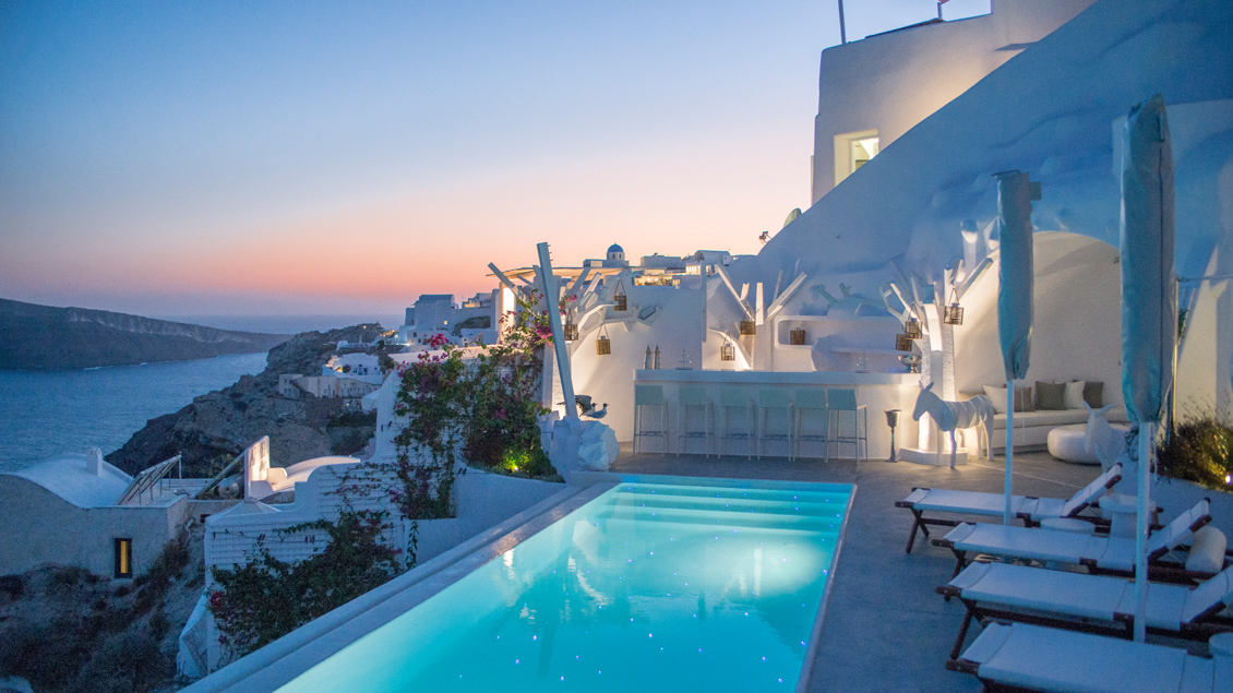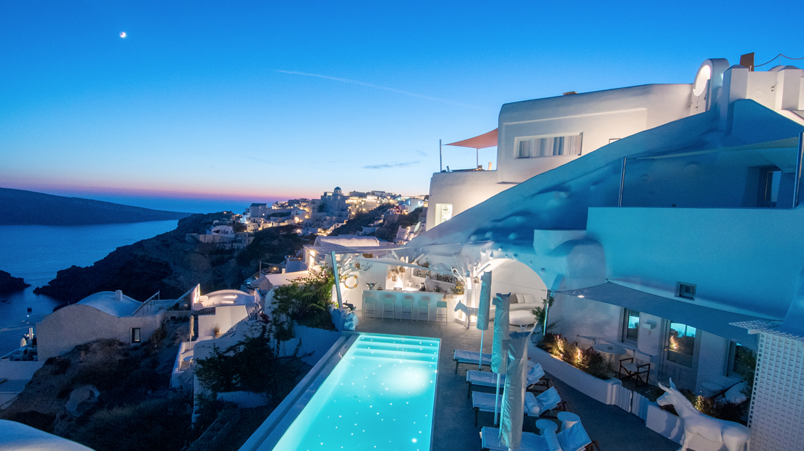 The brand new Canaves Oia, Sunday Suites (built 2016) came to join their 5 star hotels, Canaves Oia Hotel and Canaves Oia Suites, which are all located in one of the highest points of cosmopolitan Oia in  Santorini.  Carved white rocks traditional Canaves (wineries) of the 17th century have become icons were painted suites that combine modern aesthetics with traditional elements. The modern facilities of the hotels include a large swimming pool with a bar under water and a brand new infinity pool both with panoramic views of the Caldera and the volcano.