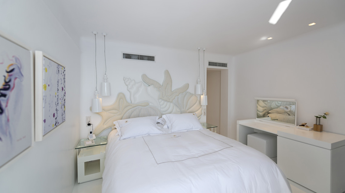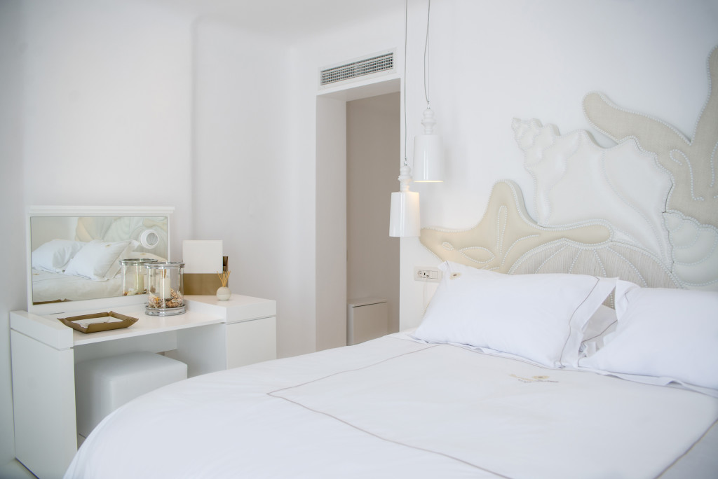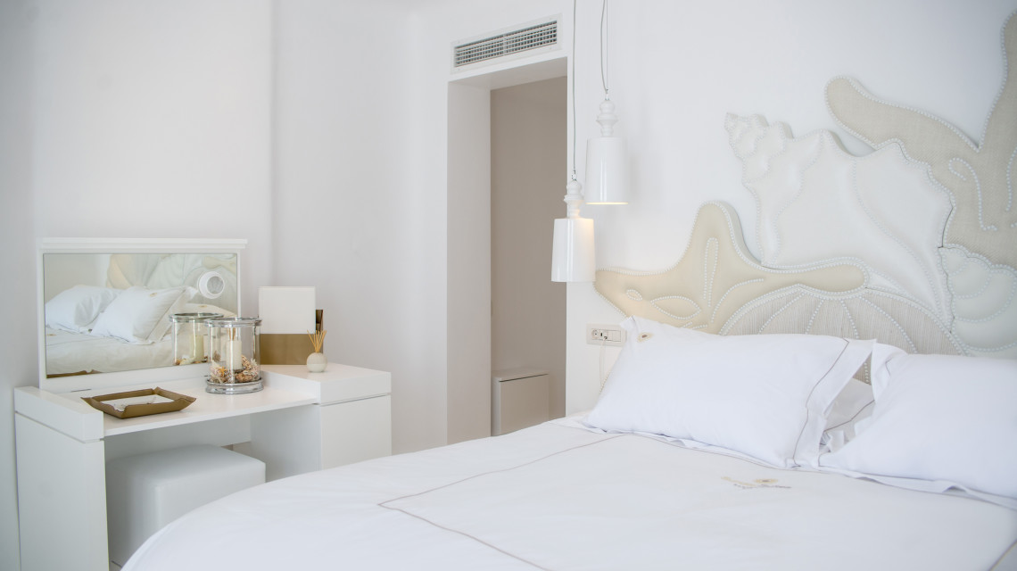 Просторная спальня с двуспальной кроватью, гостиный уголок, ванная комната с душевой кабиной и веранда с панорамным видом на Кальдеру. (25 — 30 м2)
