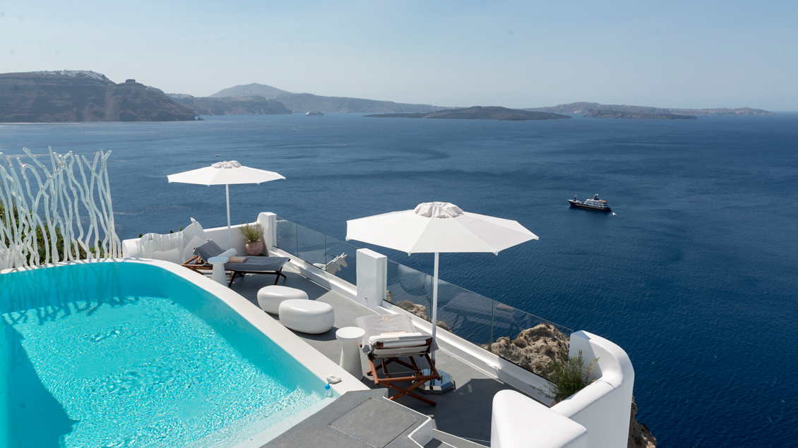 私人温水泳池和火山景色主人套房(两人入住): 一间宽敞卧室,配有大床、宽敞的起居室,浴室带淋浴,私人大阳台带有太阳床,私人户外泳池可见360度火山喷口全景。(45平米) (容纳两人入住) 卧室配备浴室,带雨淋花洒 独立宽敞起居空间, 私人大露台 私人泳池