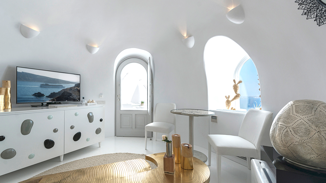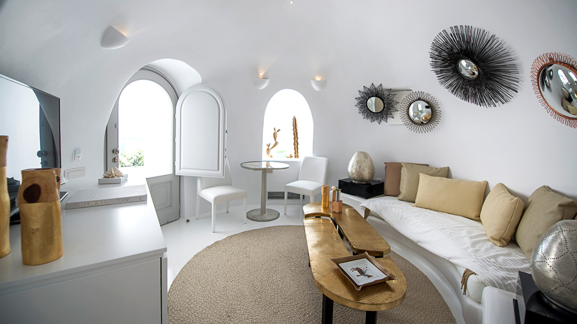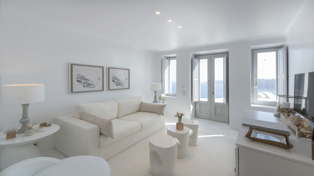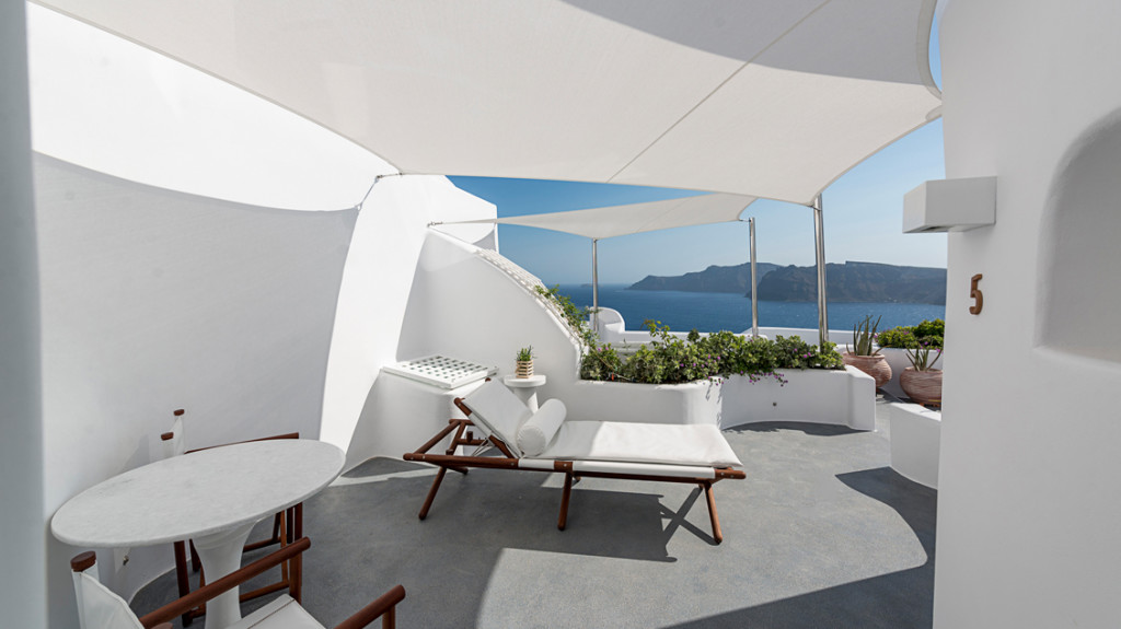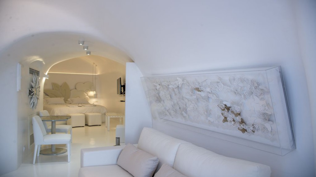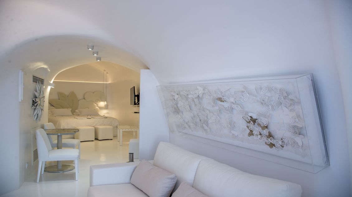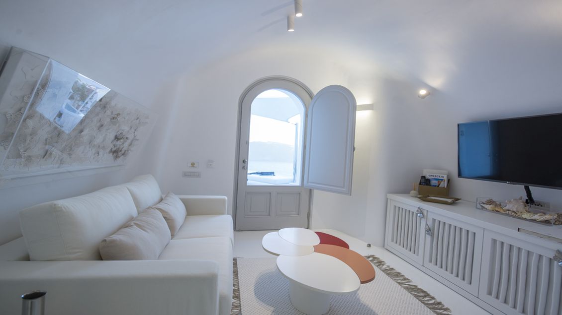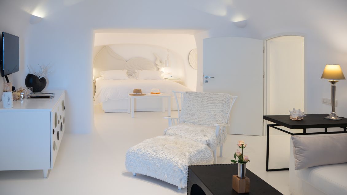 Una camera da letto spaziosa con letto king size, con zona pranzo e soggiorno, separata o aperta e bagno con doccia e veranda con vista panoramica sulla caldera. (Da 40 a 55 m2).