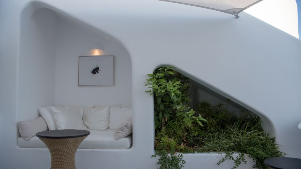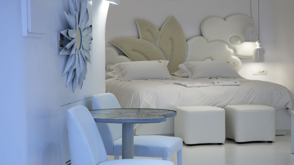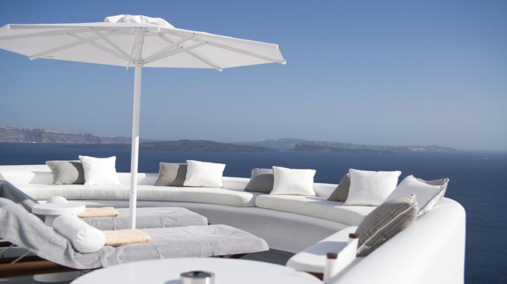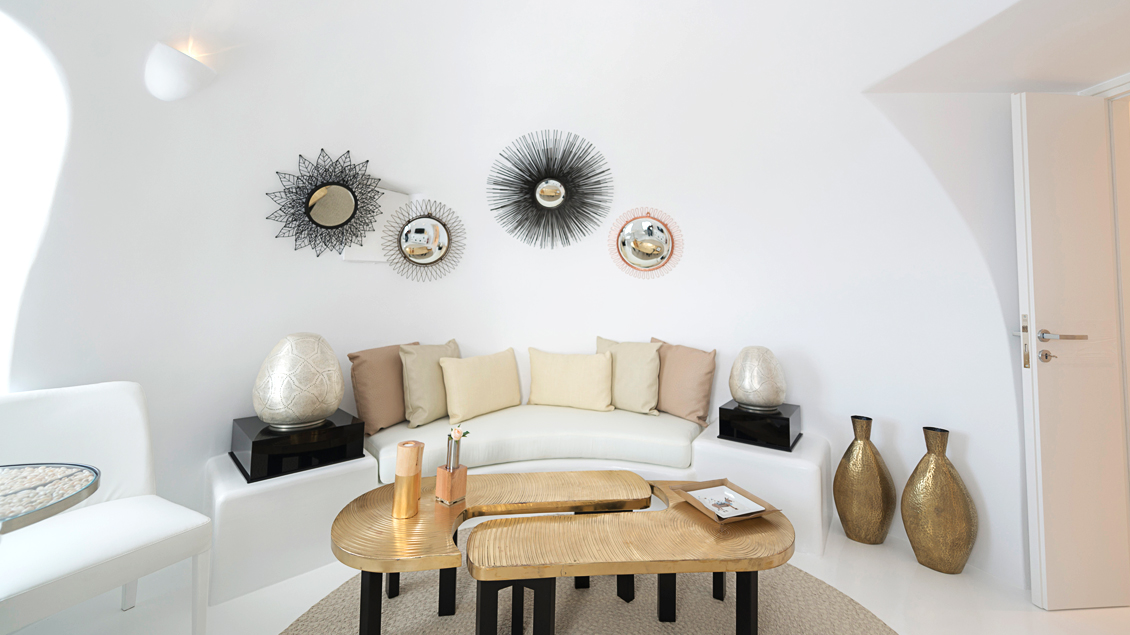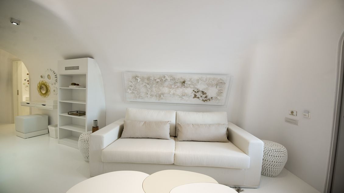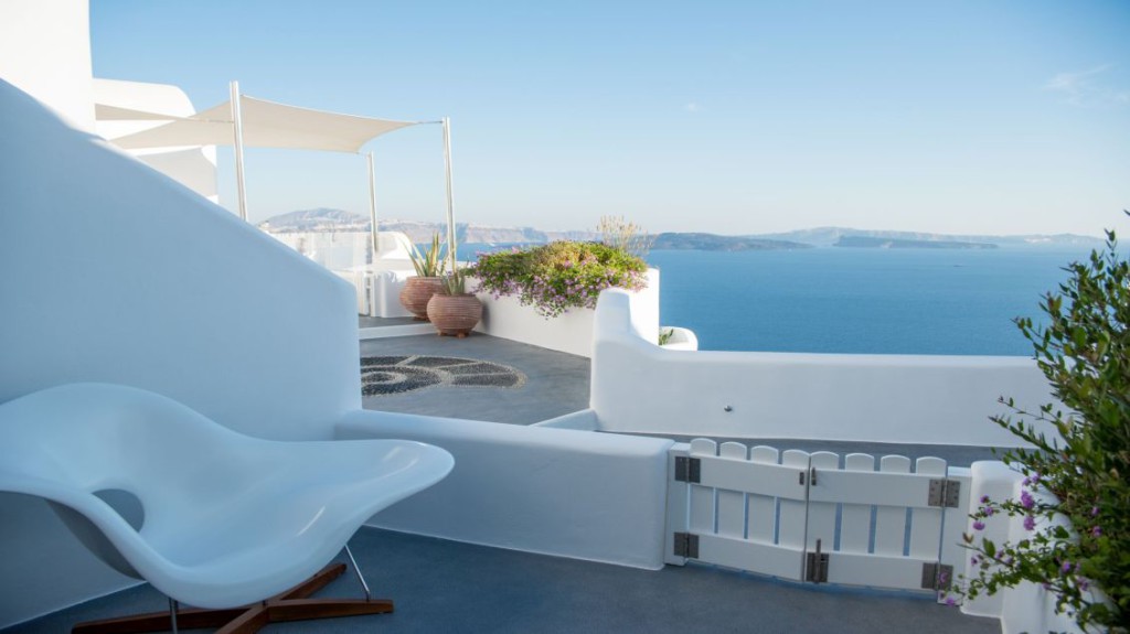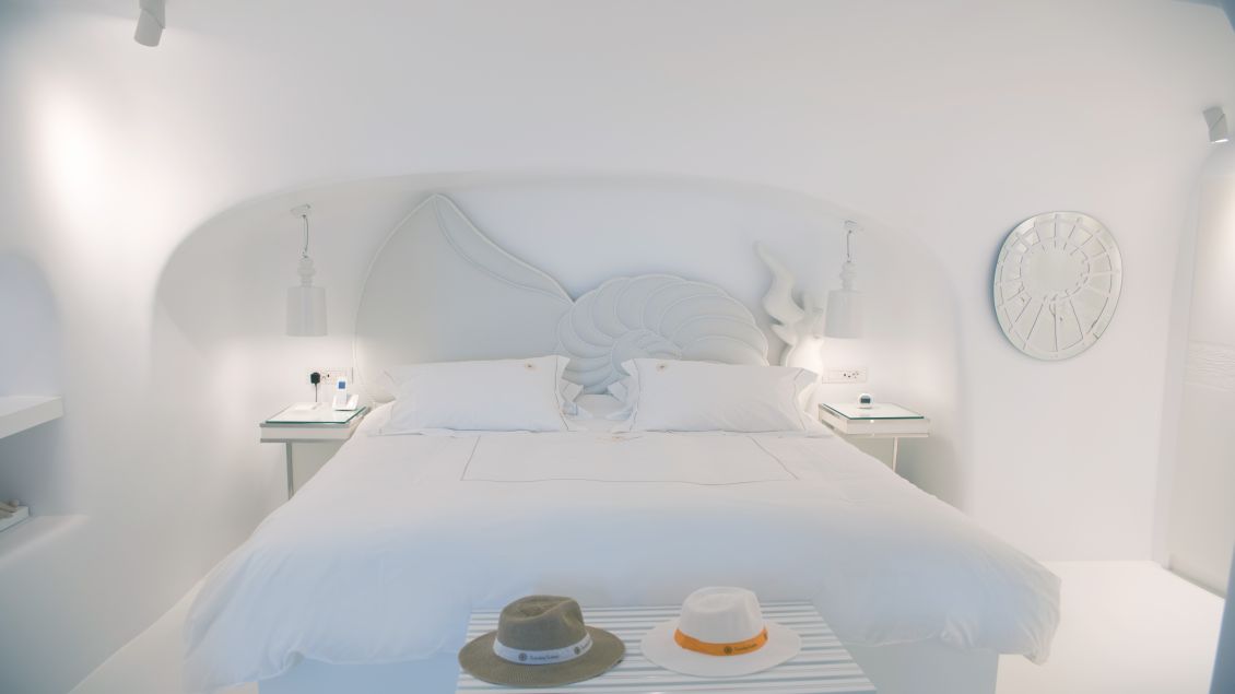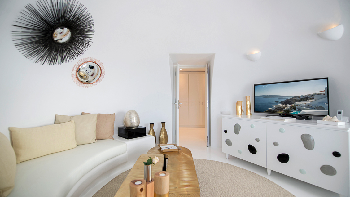 Una camera da letto spaziosa con letto king size, con zona pranzo e soggiorno, separata o aperta e bagno con doccia e veranda con vista panoramica sulla caldera. (Da 40 a 55 m2).