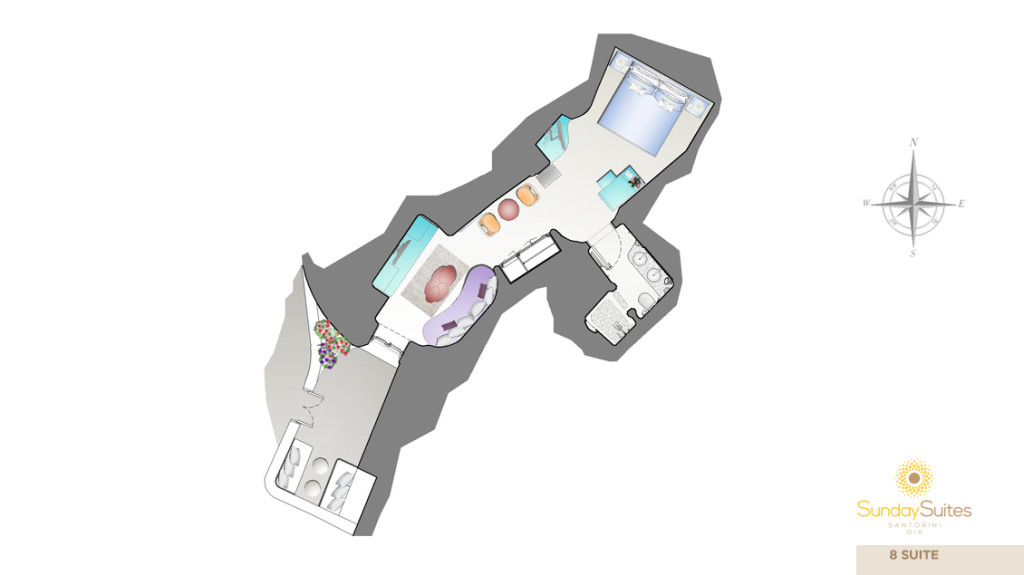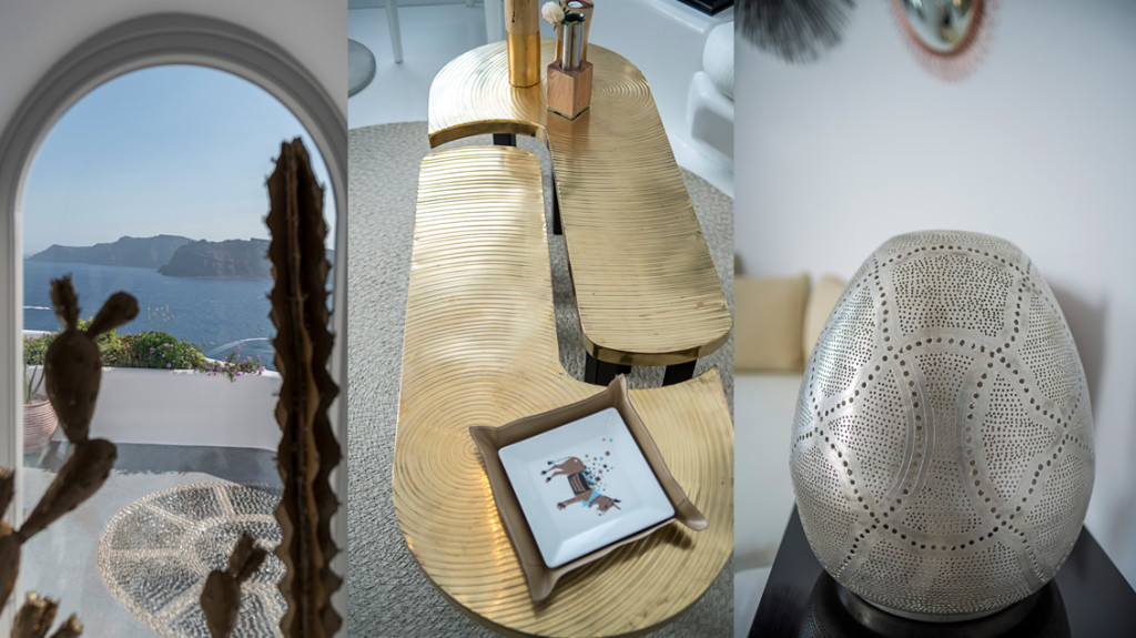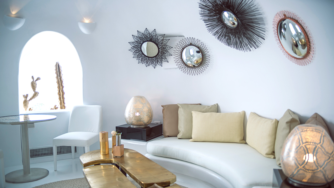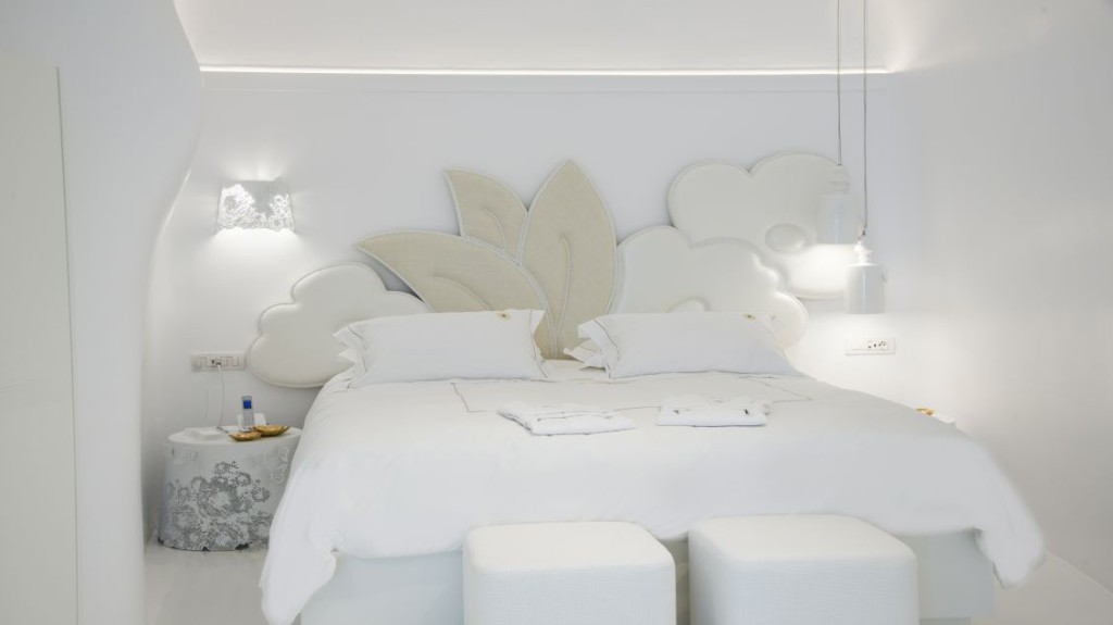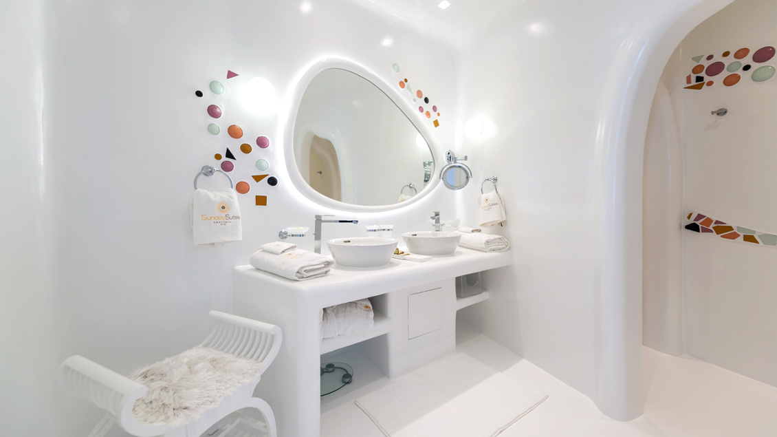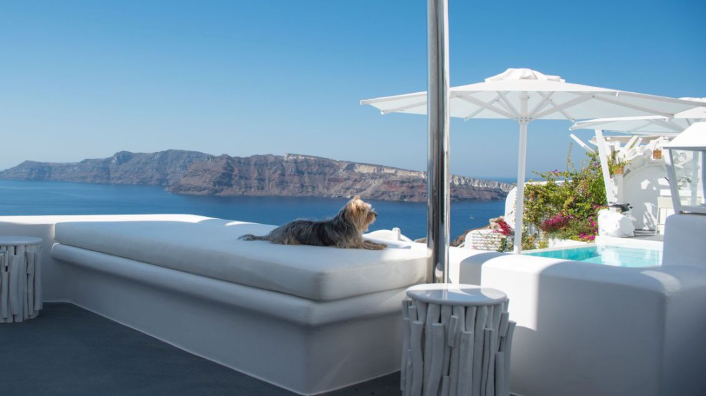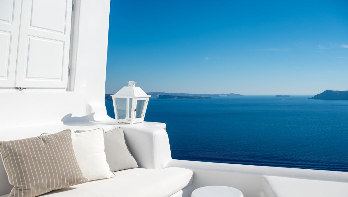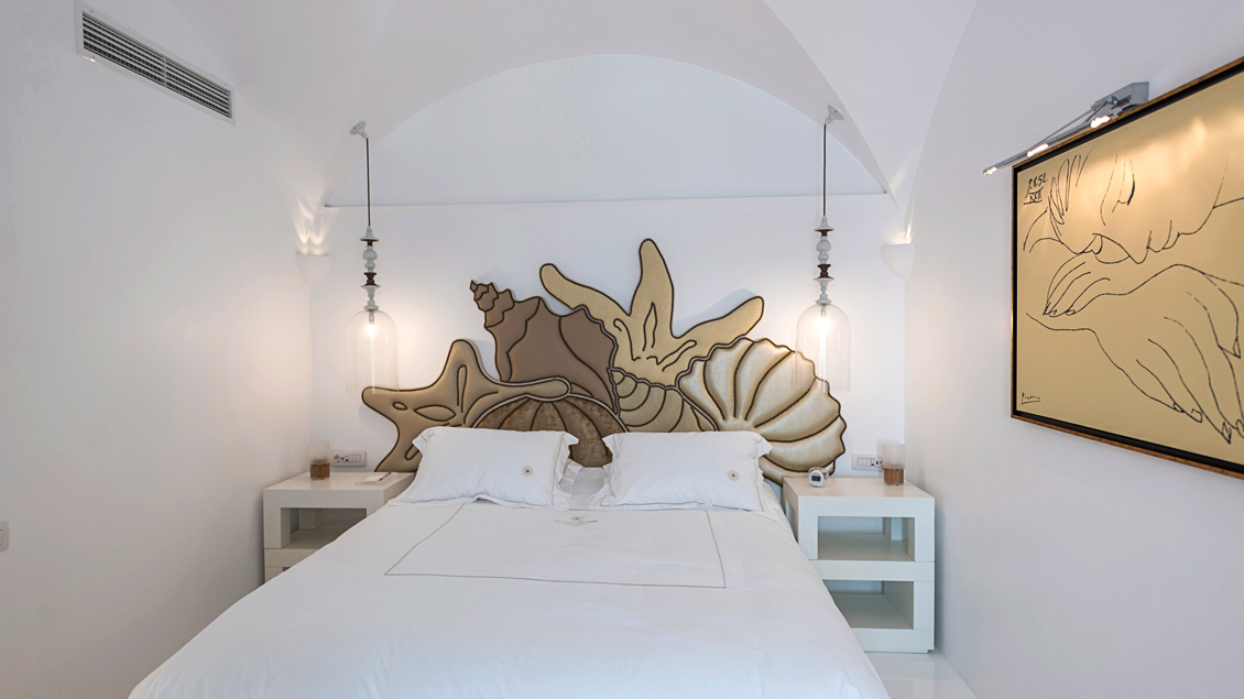 Una camera da letto spaziosa con letto king size, con zona pranzo e soggiorno, separata o aperta e bagno con doccia e veranda con vista panoramica sulla caldera. (Da 40 a 55 m2).
