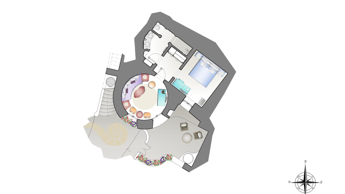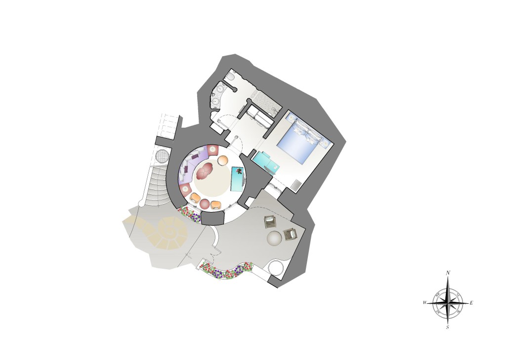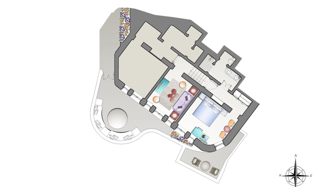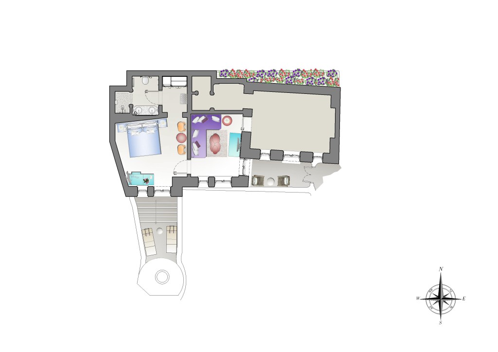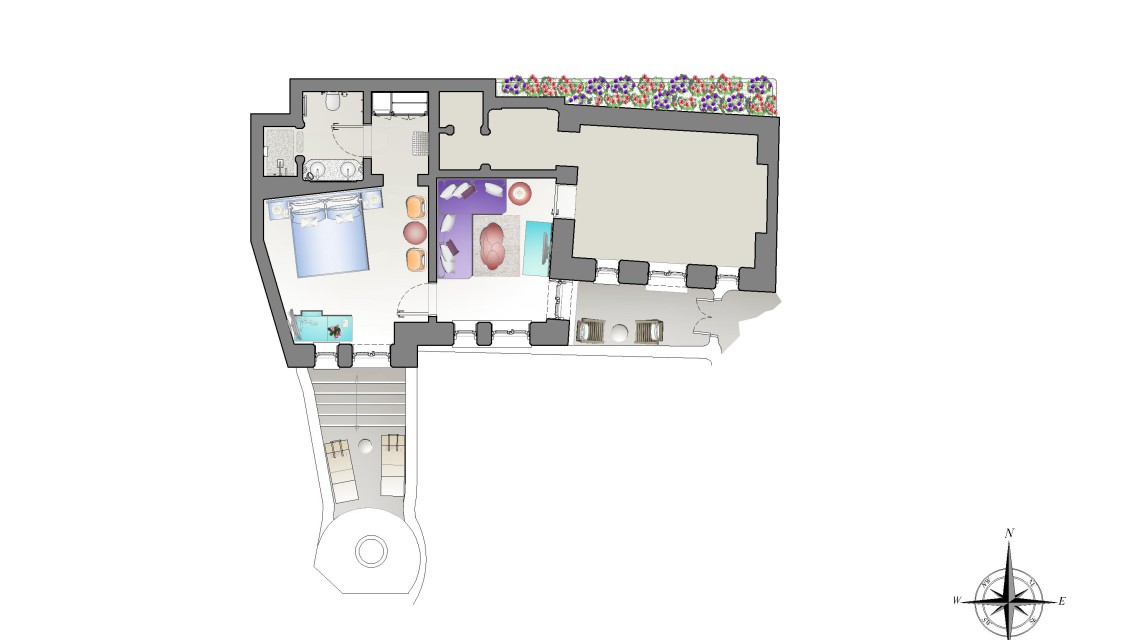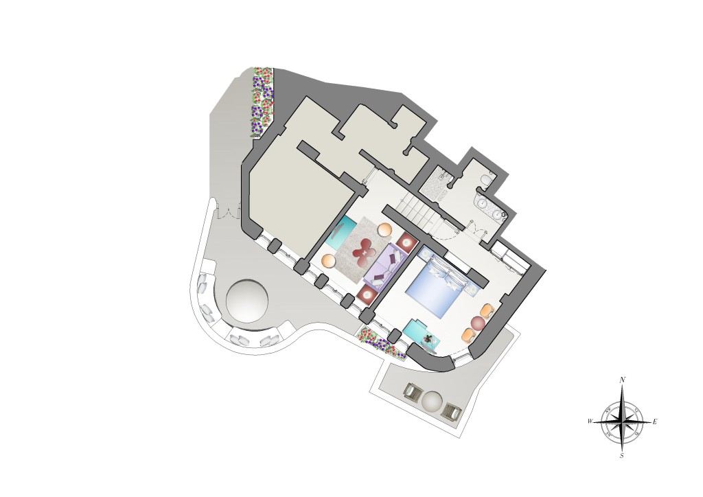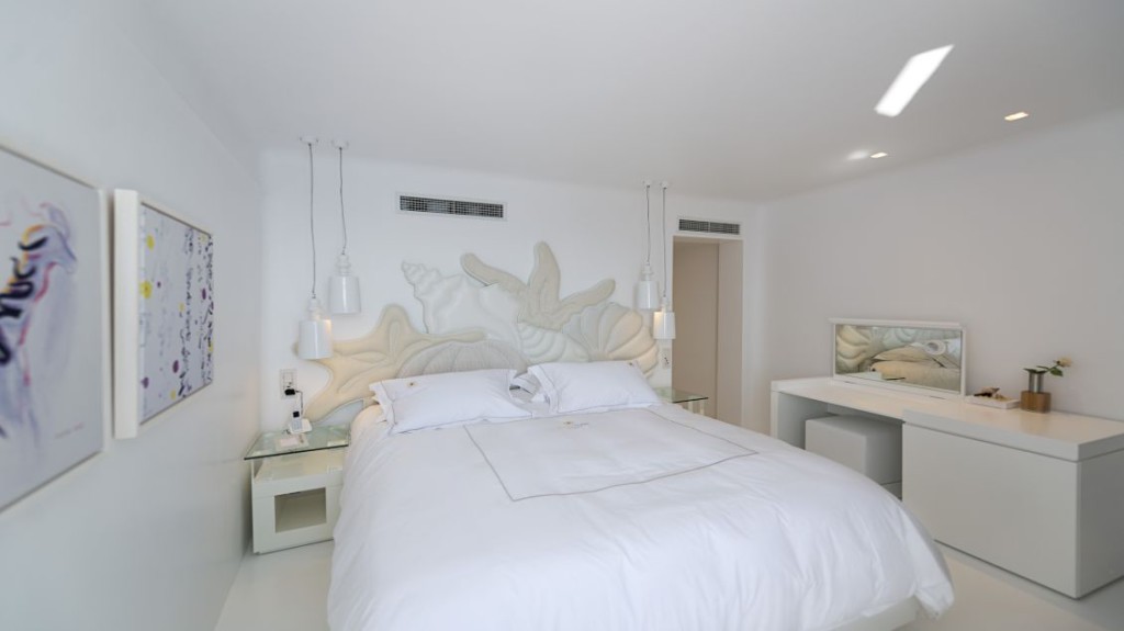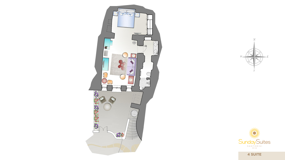 Una camera da letto spaziosa con letto king size, con zona pranzo e soggiorno, separata o aperta e bagno con doccia e veranda con vista panoramica sulla caldera. (Da 40 a 55 m2).