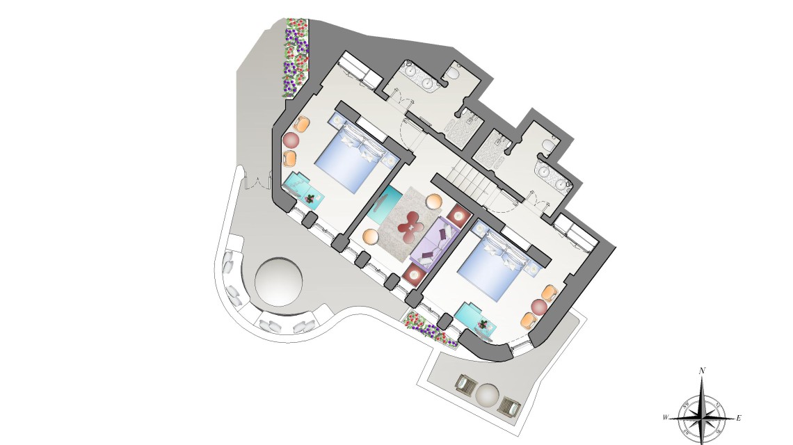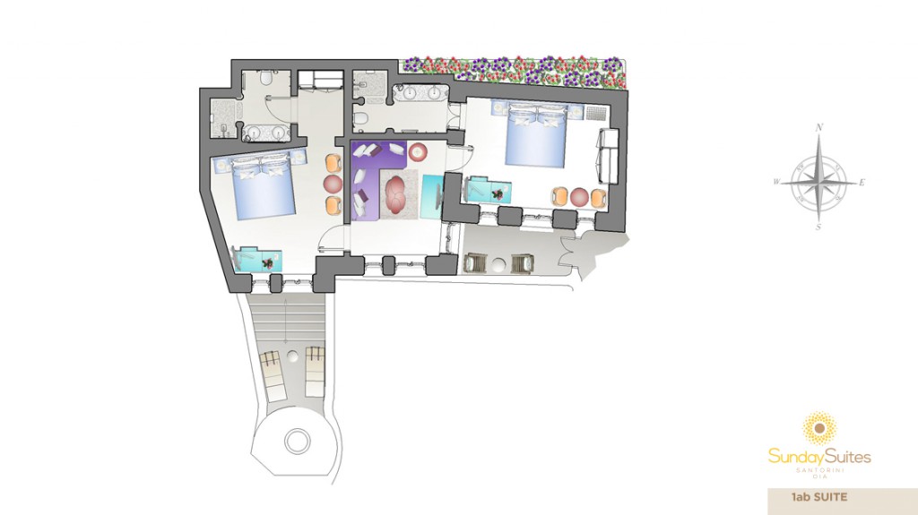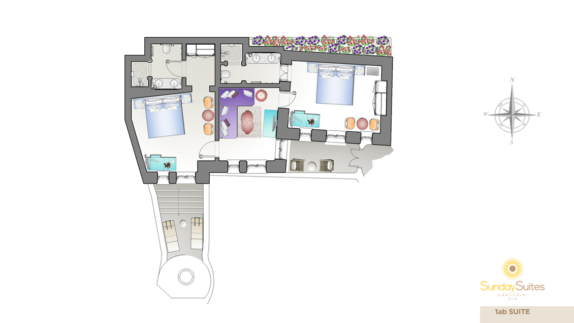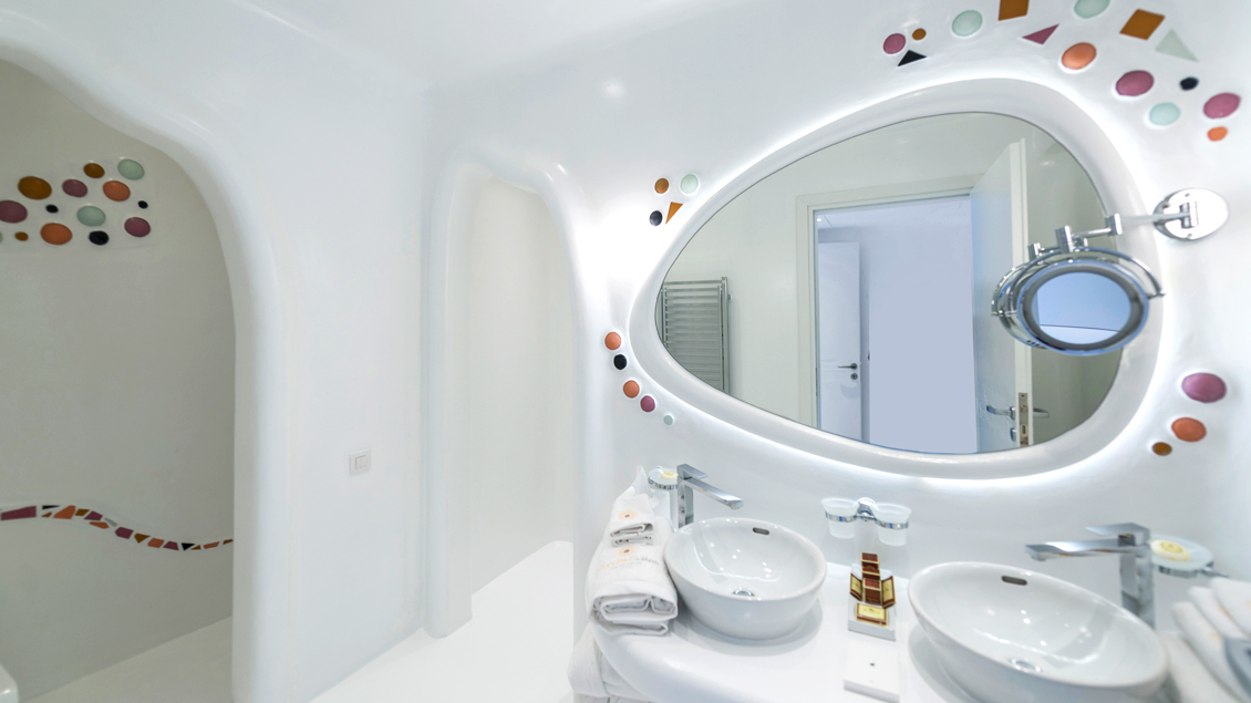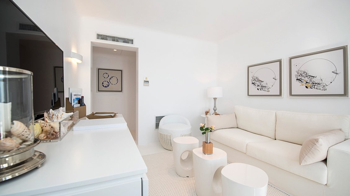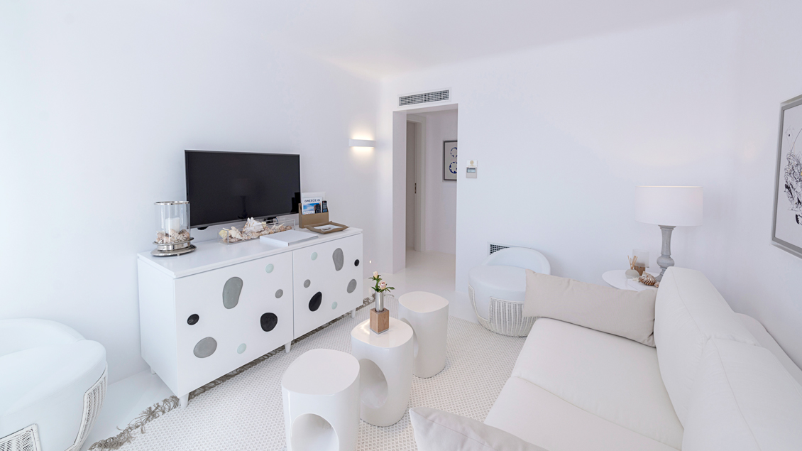 Δύο άνετα Υπνοδωμάτια με king size κρεββάτια, ξεχωριστό καθιστικό , 2 ιδιωτικά μπάνια με ντουζ και βεράντα με πανοραμική θέα της Καλντέρας (70 to 80 τ.μ.)